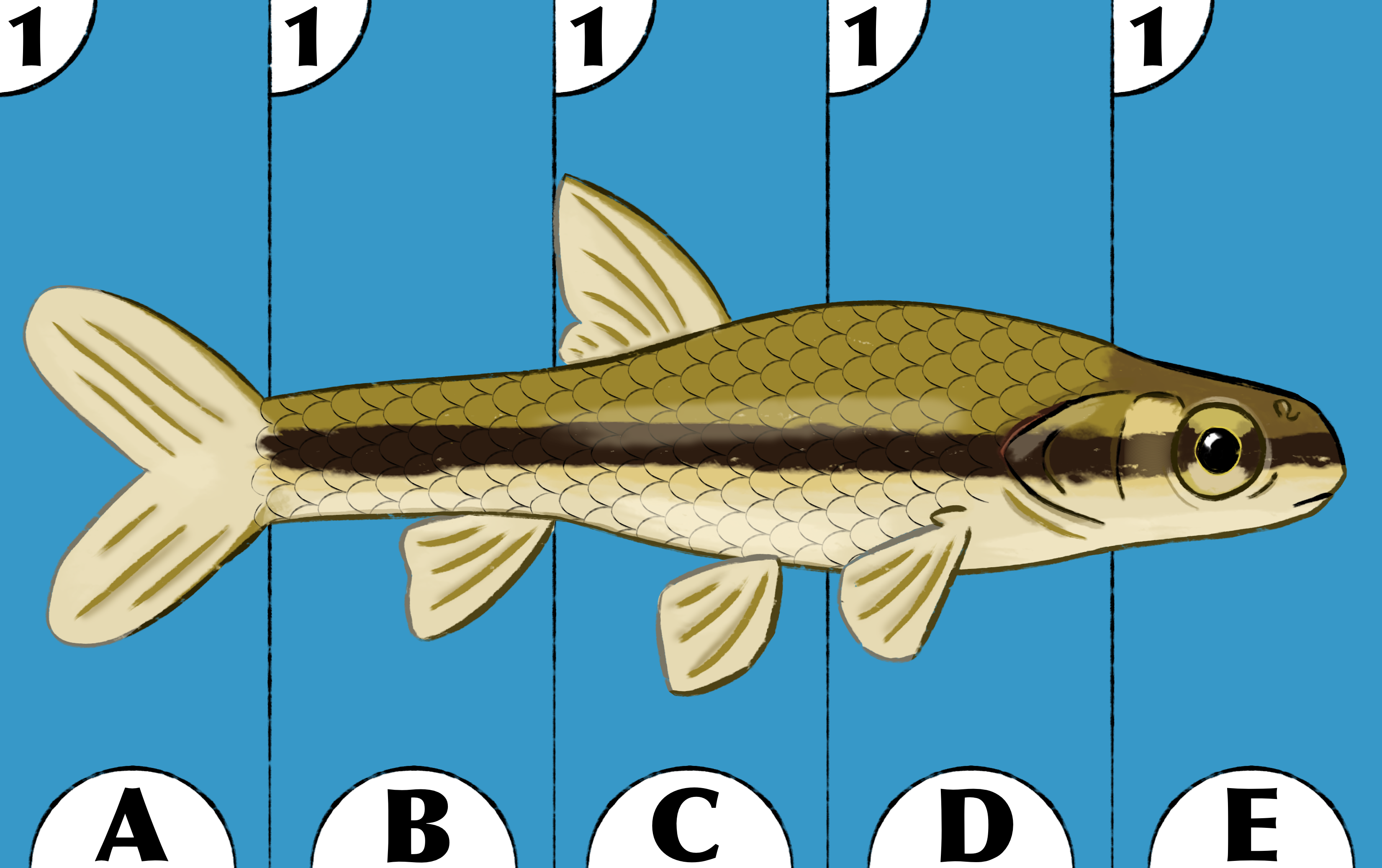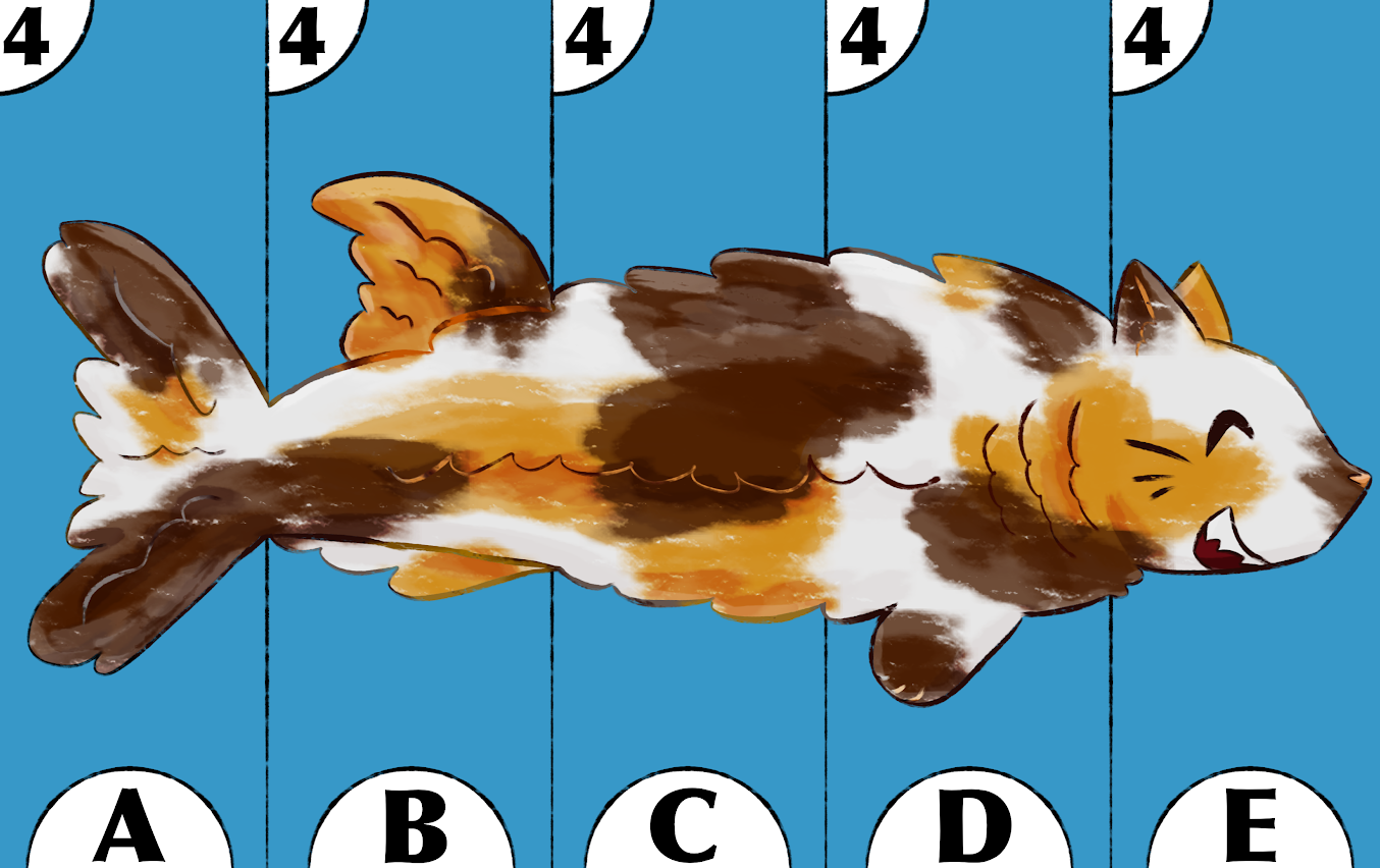 The card art below was half of the card art for a project in Game Design 1 where we had to create a party game. Our game was called "Darwin" and was based on evolving these fish and fighting enemies and bosses, the numbers on the cards being their strength. The lines on the cards would be cut, so there would be 5 strips of each fish, and they would then be "Frankensteined" together.
